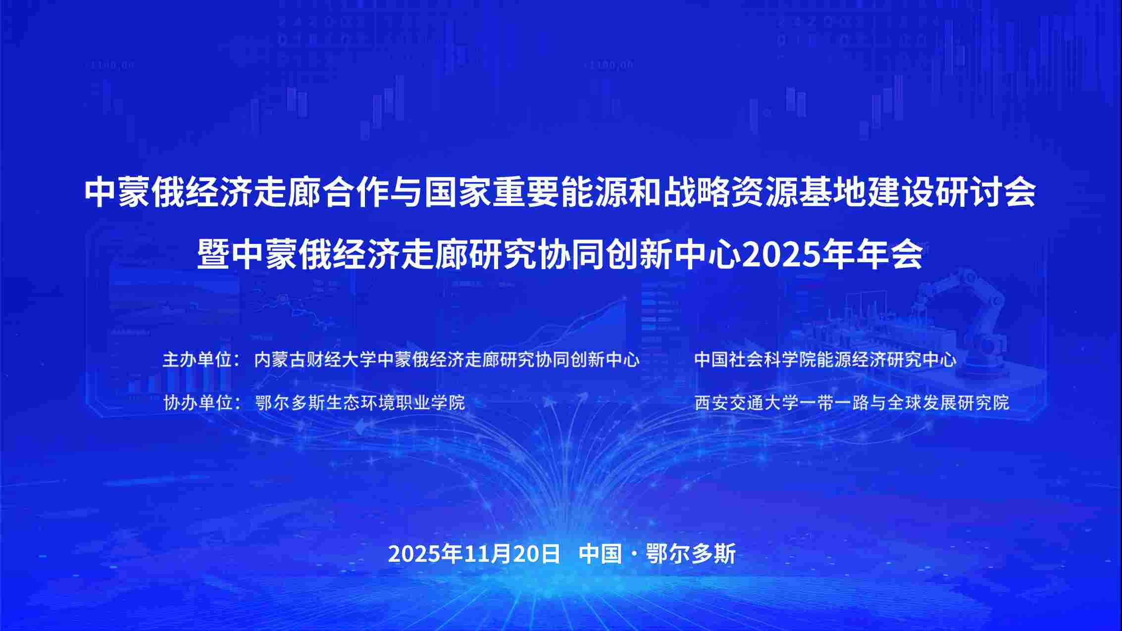 11月20日,由内蒙古财经大学中蒙俄经济走廊研究协同创新中心、中国社会科学院能源经济研究中心联合主办,鄂尔多斯生态环境职业学院、西安交通大学“一带一路”与全球发展研究院协办的中蒙俄经济走廊合作与国家重要能源和战略资源基地建设研讨会暨中蒙俄经济走廊研究协同创新中心2025年年会在鄂尔多斯生态环境职业学院举行。