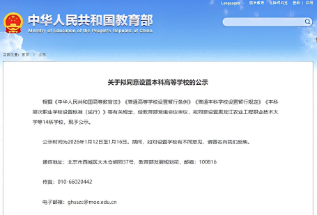 根据《中华人民共和国高等教育法》《普通高等学校设置暂行条例》《普通本科学校设置暂行规定》《本科层次职业学校设置标准(试行)》等有关规定,经教育部党组会议审议,拟同意设置黑龙江农业工程职业技术大学等14所学校,现予公示。公示时间为2026年1月12日至1月16日。其中赤峰学院更名赤峰大学。